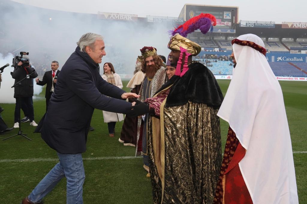 La Romareda ha llenado buena parte de sus gradas con más de 9.000 niños y niñas, acompañados de sus familiares, para recibir a Sus Majestades los Reyes Magos de Oriente. Aunque inicialmente estaba prevista la llegada en helicóptero hasta el césped del estadio, finalmente ese vuelo ha tenido que ser suspendido por la intensa niebla. Melchor, Gaspar y Baltasar han llegado por otros medios y han hecho su aparición en el campo a través del túnel de vestuarios.