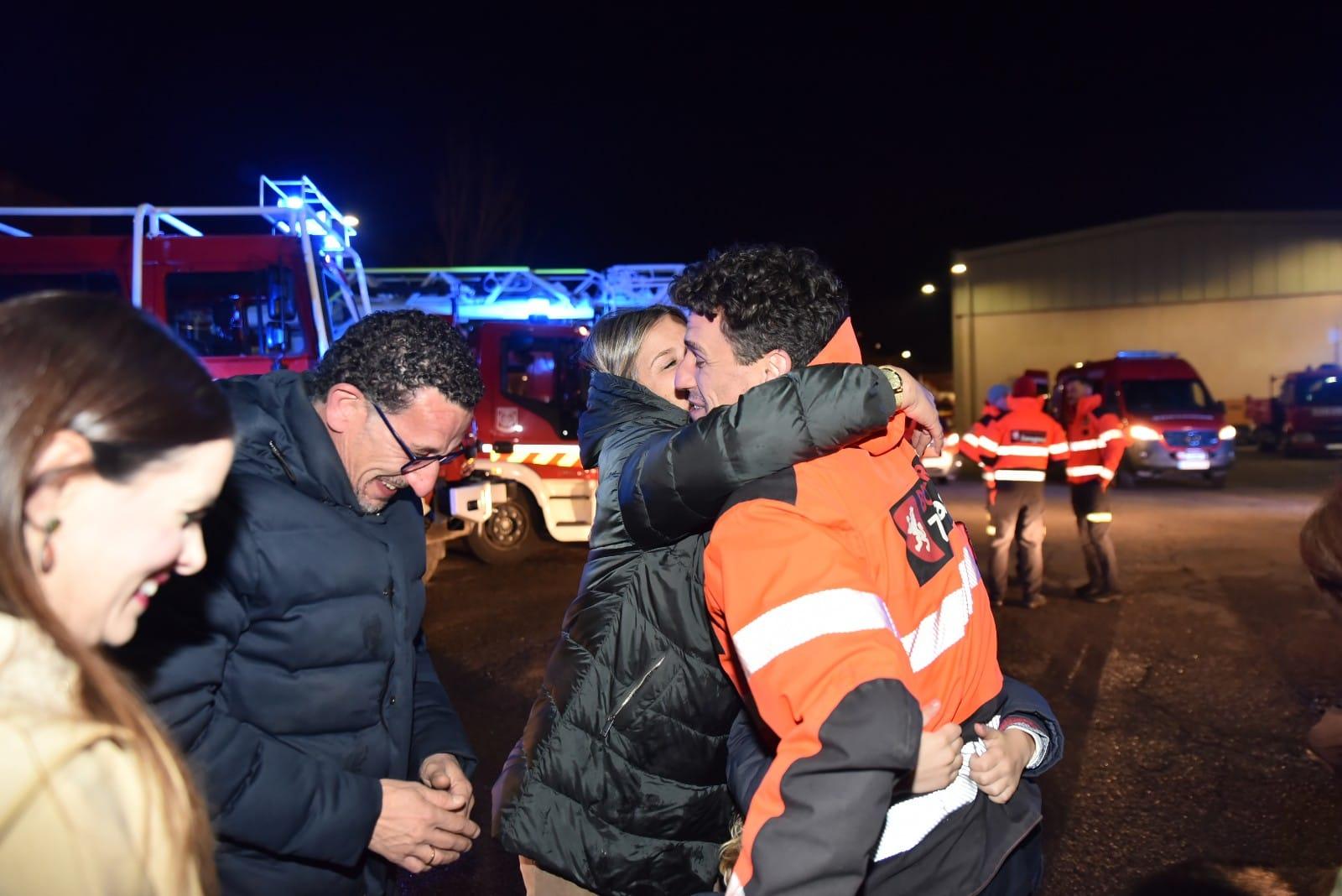 Después de un largo viaje, el operativo compuesto por Quique Mur, Emilio Ramón, Marta Gasca, Leticia Villuendas, Pablo Monsalve y Enrique Berges, y los perros rescatadores Tom, India y Dea, han llegado al parque 1 de Bomberos, donde les esperaban sus familiares y compañeros