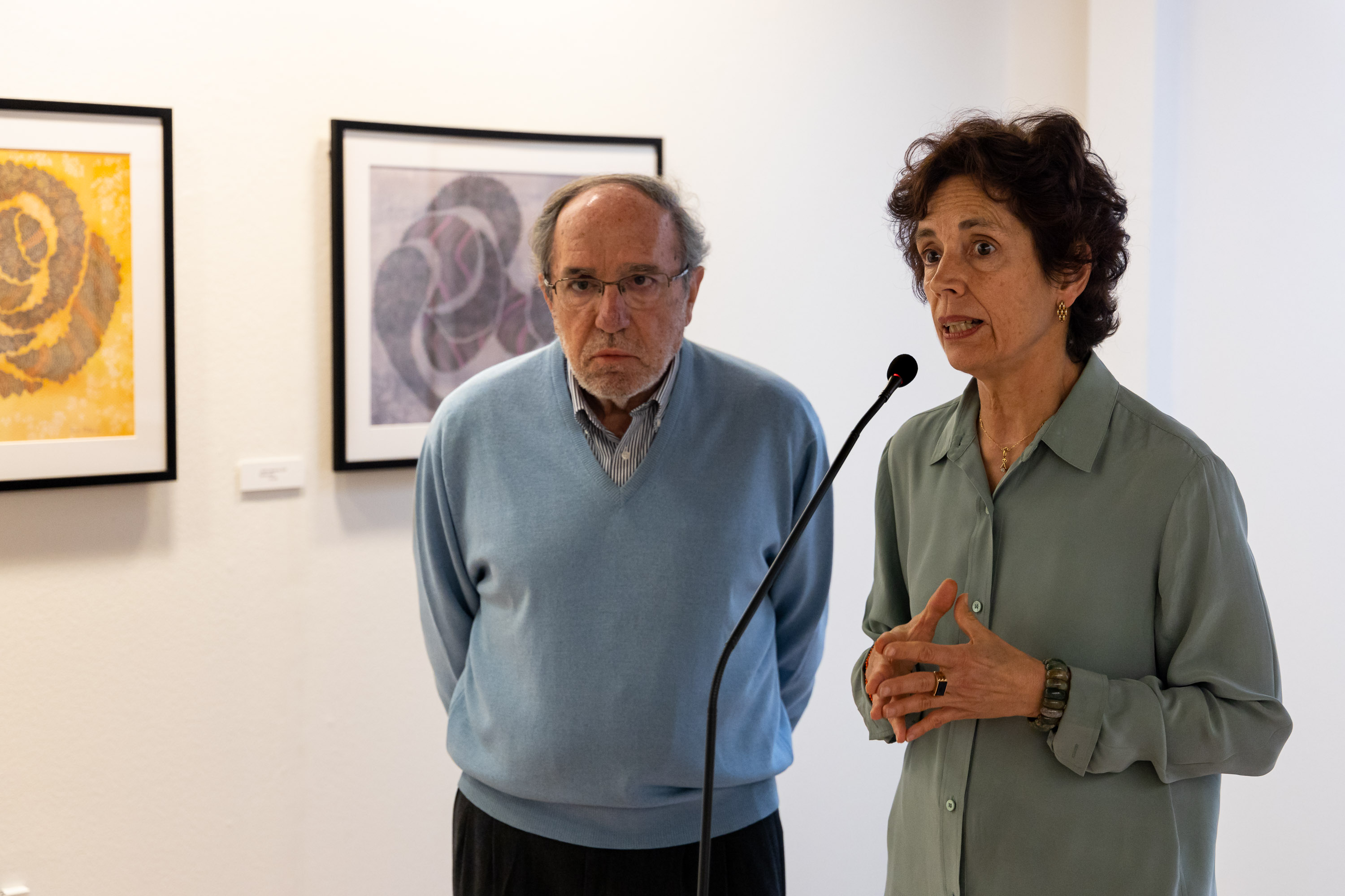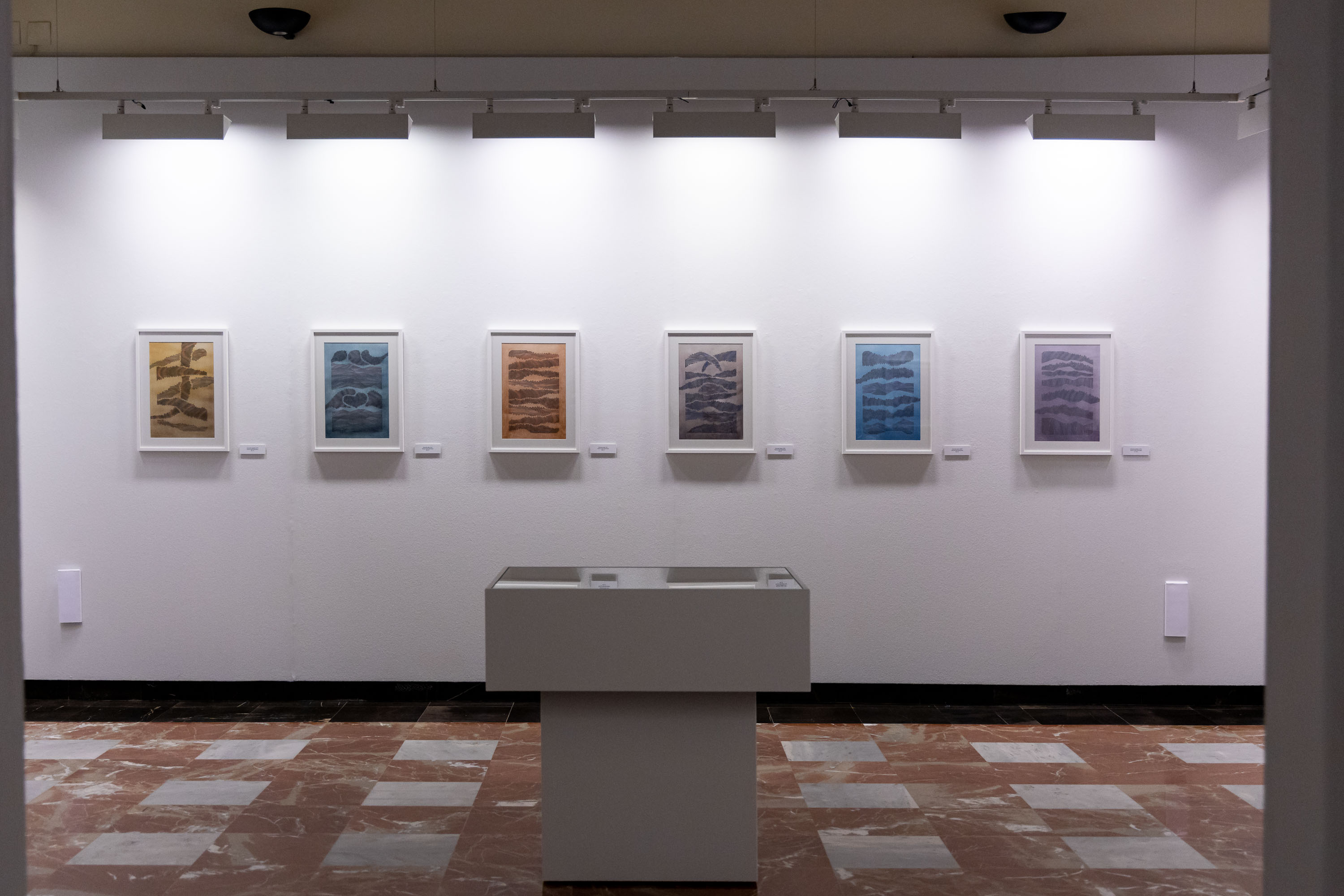 La exposición está integrada por 45 obras realizadas en papel, que se reparten en tres espacios. El primero de ellos cuenta con 17 piezas agrupadas por tamaños, en el que destacan visualmente las dos de mayor dimensión de la muestra, dos formas ingrávidas posadas de forma volátil y liviana.