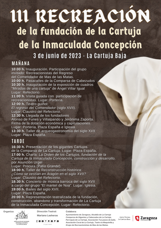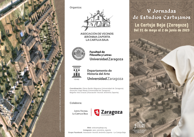 Esta cita, que cumple ya su tercera edición, está organizada por la Asociación Vecinal Jerónima Zaporta, el departamento de Historia del Arte de la Universidad de Zaragoza y la Junta Vecinal de la Cartuja Baja, con el objetivo acercar el rico patrimonio histórico y cultural de esta emblemática cartuja española. Jornadas de Estudios Cartujanos Como novedad, este año se celebran las Jornadas de Estudios Cartujanos, una actividad que se retoma tras 17 años de pausa y que cuenta con el apoyo de la Universidad de Zaragoza.