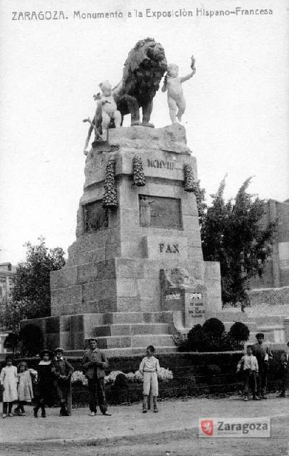 El 'Monumento a la Exposición Hispano-Francesa de 1908' fue erigido en 1910 en el paseo de Pamplona, junto a la salida del entonces camino de los Cubos, hoy calle de Doctor Cerrada, y la plaza de Basilio Paraíso, frente al edificio del Paraninfo y a la Capitanía General. Si bien, en un principio se pensó ubicarlo en la plaza de Santa Engracia como marco de acceso a los terrenos donde levantaron en 1908 los pabellones efímeros de la Muestra Hispano-Francesa, e incluso se debatió la posibilidad de instalarlo en la plaza de San Miguel.