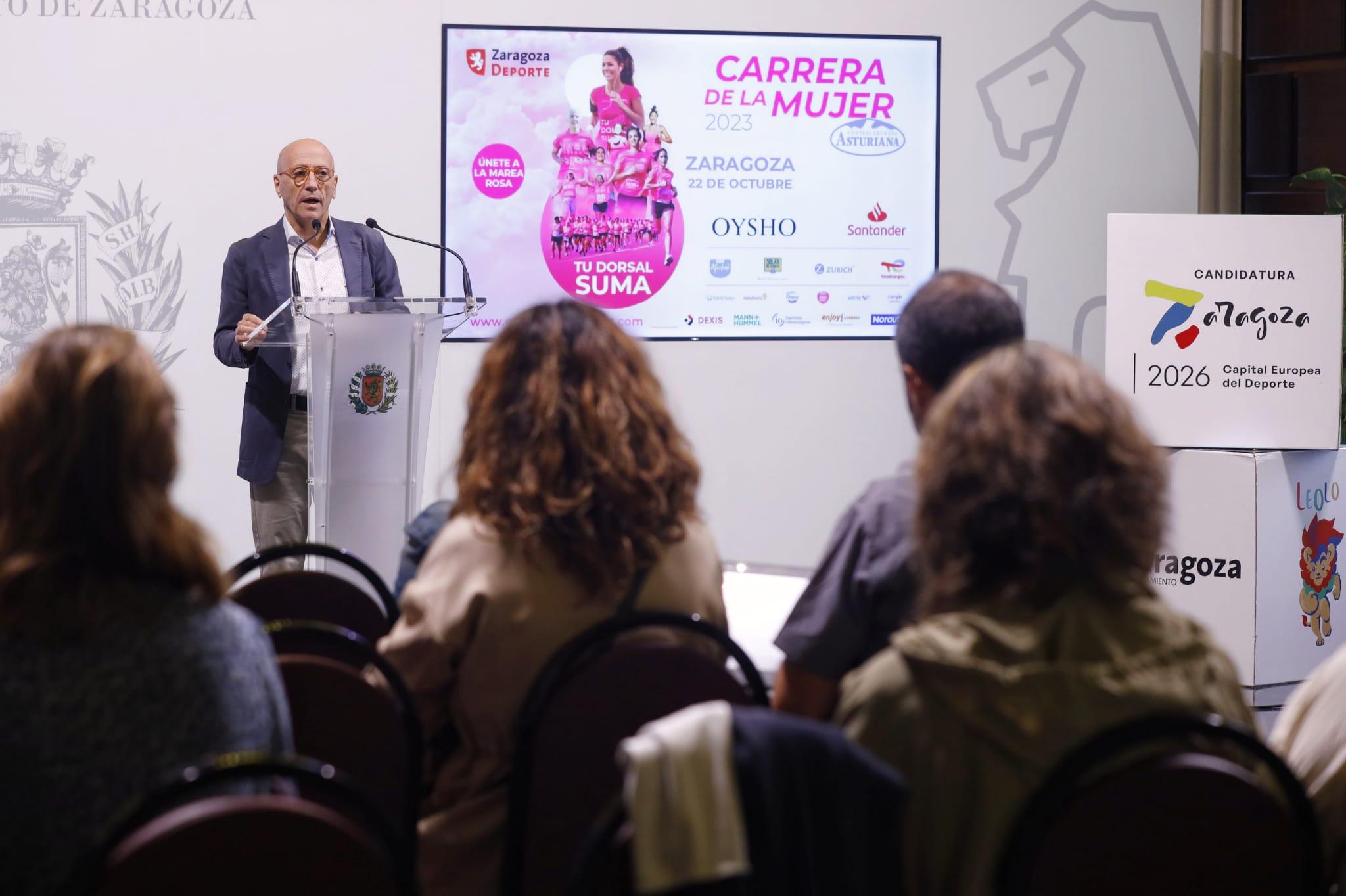 Fomentar el deporte femenino y luchar contra el cáncer y contra la violencia de género vuelven a ser los objetivos principales de la carrera, que hoy ha sido presentada en el Ayuntamiento de Zaragoza por Félix Brocate, concejal delegado de Deportes; Henar Calleja, portavoz de la organización; María José Rivas, presidenta de la Asociación de Mujeres Aragonesas de Cáncer Genital y de Mama; Amparo Magallón, paciente y socia de la Asociación Española de Cáncer de Mama Metastásico; y la atleta Luisa Larraga.