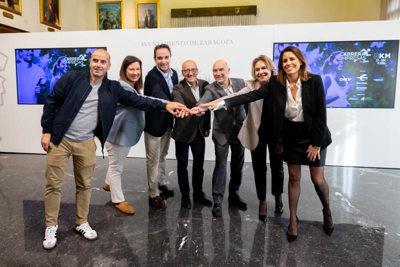 El Ayuntamiento de Zaragoza ha acogido hoy la presentación de la prueba, con la asistencia del concejal de Deportes, Félix Brocate; el director de ESIC Aragón, Antonio Sangó; el director técnico de la carrera, Roberto García; la jefa de Imagen, Patrocinios y Experiencia de Cliente de Ibercaja, Carmen Pérez; el director provincial de DKV Zaragoza y Teruel, Juan Luis Pintiel; la directora de RRHH de Cablescom, Isabel Banzo; y la directora de Marketing de Araven Group y Shop&Roll, Blanca Savirón.
