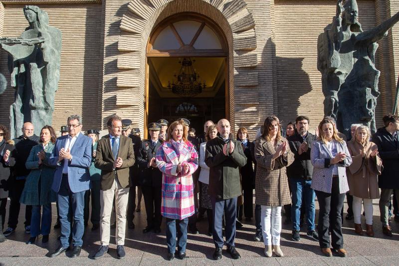 Momentos antes, la alcaldesa de Zaragoza, Natalia Chueca, acompañada por la corporación municipal, y representantes del tejido social de la ciudad, han guardado un minuto de silencio en las puertas del Consistorio, en cuyo balcón principal lucía ya la pancarta conmemorativa del 25-N. Además, las principales fuentes de la ciudad se iluminarán esta noche y mañana, 25 de noviembre, de color violeta.