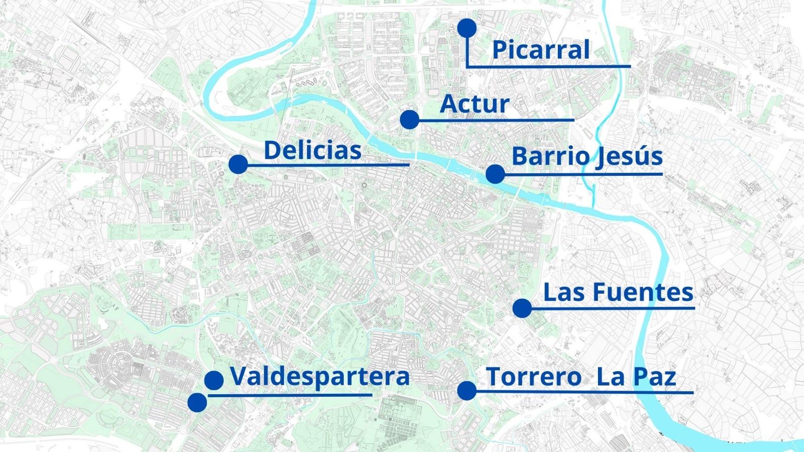 Estas mil viviendas están repartidas en barrios de la ciudad consolidada. Los suelos municipales se sitúan en Las Fuentes (en el encuentro entre la calle Miguel Servet y la Ronda Hispanidad), Torrero-La Paz (junto al campo de fútbol José Luis Violeta), Picarral (cruce San Juan de la Peña con Alcalde Caballero), Delicias (junto al IES Santiago Hernández) y el Barrio Jesús (junto al río Ebro). Mientras, los suelos correspondientes al gobierno de Aragón se ubicarán en Valdespartera (junto a las plazas Cleopatra y Viaje a la Luna) y el Actur (en María Zambrano a la altura de Manuel Marraco Marrón).