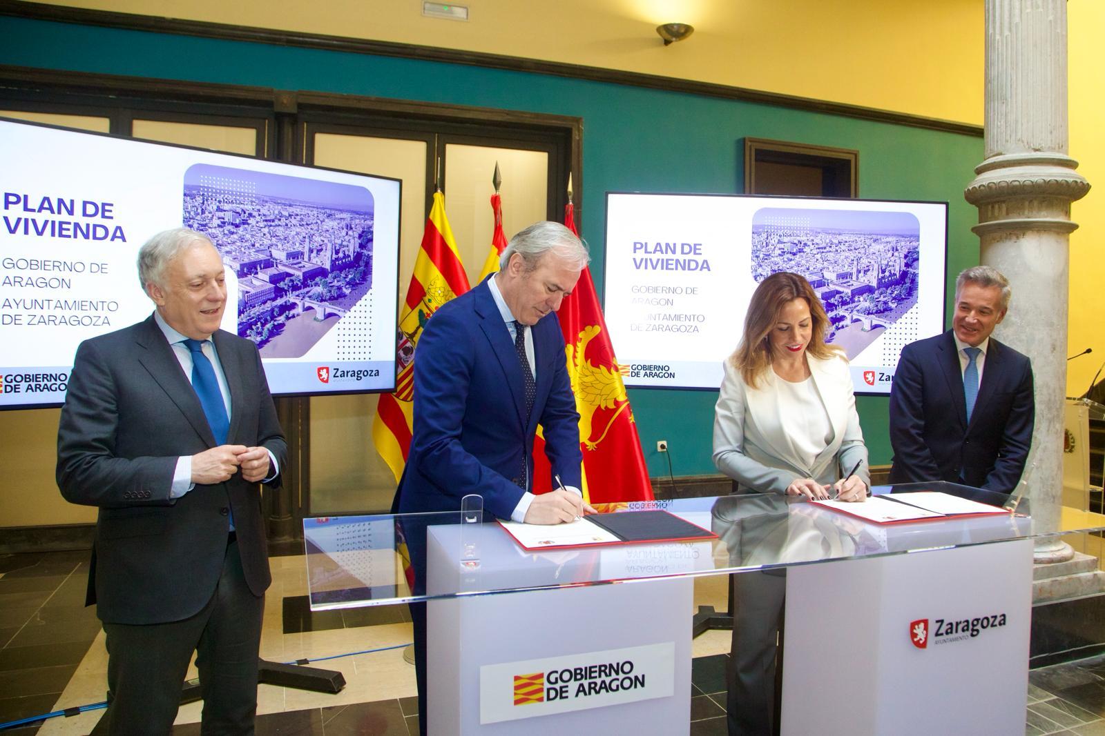 El presidente de Aragón, Jorge Azcón, y la alcaldesa de Zaragoza, Natalia Chueca, han firmado el protocolo de colaboración para impulsar el parque inmobiliario de alquiler asequible en la ciudad