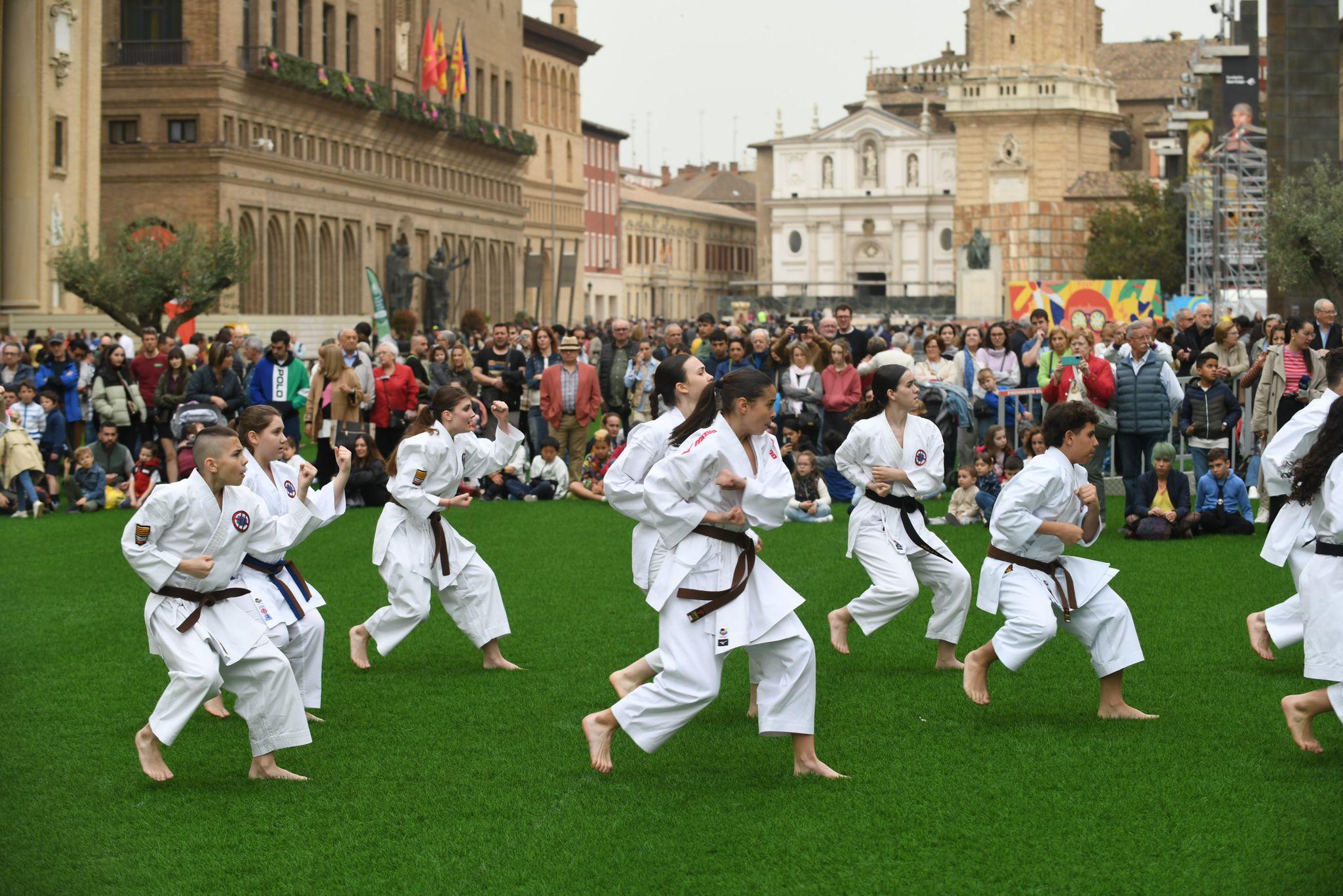 Para culminar la jornada, entre las 18.30 y las 20.00 horas habrá dos eventos simultáneos. Por un lado, una exhibición de taekwondo, donde también habrá tiempo para que quienes lo deseen puedan practicarlo con la ayuda de expertos. Por otro, los deportes tradicionales tendrán un hueco en la plaza del Pilar gracias a la colaboración con la Federación Aragonesa de Juegos Tradicionales. Experimentados deportistas en la materia mostrarán cómo jugaban las generaciones pasadas e invitarán a hacerlo a los asistentes.
