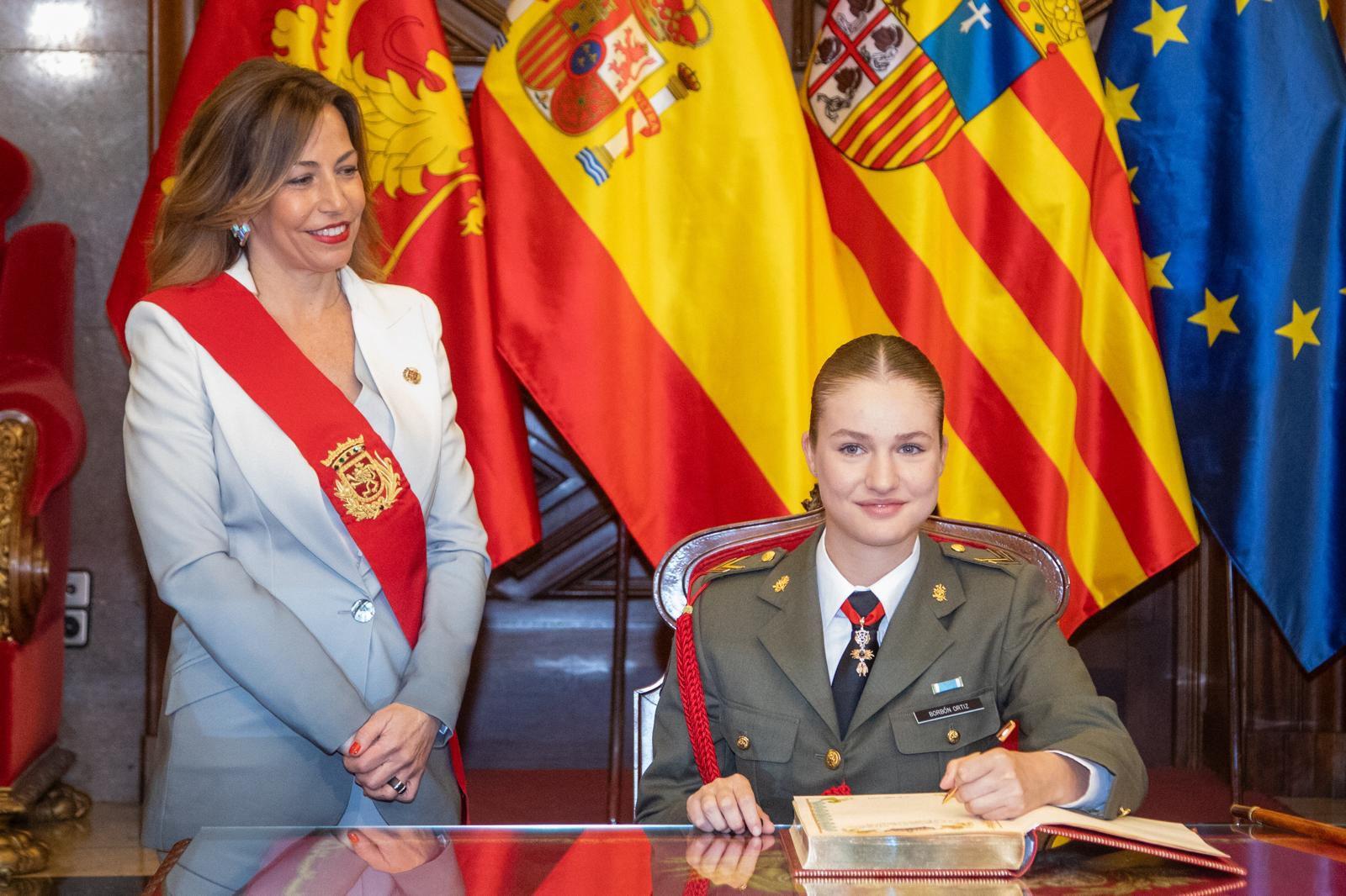 Su Alteza Real ha firmado en Libro de Oro y luego se ha trasladado hasta el Salón de Recepciones donde, de manos de Chueca, ha recibido el título de Hija Adoptiva de Zaragoza. La regidora ha destacado que se trata de una ocasión "solemne y de gran trascendencia para nuestra ciudad, pues Zaragoza otorga su máxima distinción a la Princesa Leonor coincidiendo con su estancia en la Academia General Militar para recibir su formación, en una ceremonia que traerá a la mente de muchos zaragozanos aquel 16 de mayo de 1986, en el que Su Alteza Real el Rey Felipe VI recibió el mismo Título, cuando cursaba sus estudios en Zaragoza".