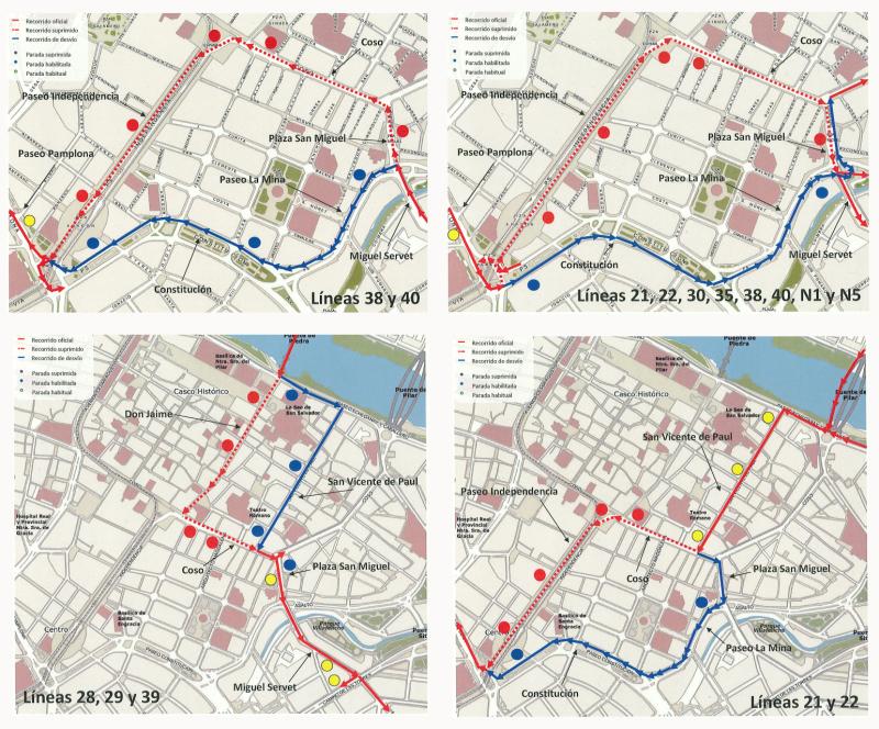 El Paseo de la Independencia, por su parte, quedará cortado desde la calle San Miguel y el tráfico se redirigirá preferentemente por Paseo de la Constitución. Las calles de Amar y Borbón y de Rufas, entretanto, quedarán en fondo de saco para acceso exclusivo a los garajes, mientras que Jerónimo Blancas continuará cortada al tráfico como hasta ahora debido a las obras que se están realizando en ella. En la calle Espartero el tráfico podrá girar únicamente a la derecha, en dirección al río Ebro.