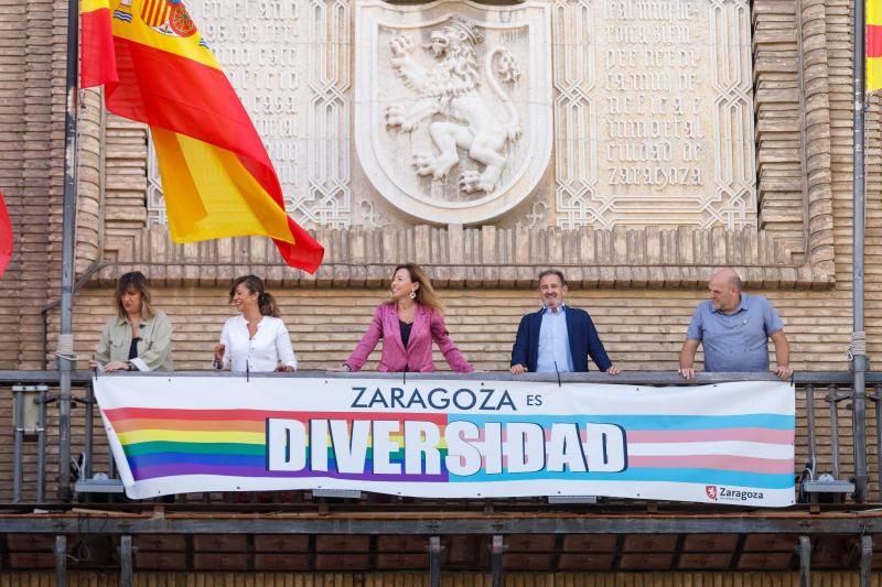 El balcón principal del Ayuntamiento luce ya la pancarta y las fuentes se iluminarán esta noche con los colores del arcoíris. Como cada 28 de junio, la alcaldesa de Zaragoza, Natalia Chueca, junto a los portavoces de los grupos municipales, han colocado este viernes la pancarta con el lema 'Zaragoza es diversidad' en el balcón del salón de plenos, mostrando el compromiso de la ciudad con la igualdad.