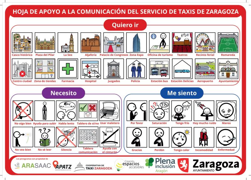 Así, cada taxi contará con una hoja de apoyo a la comunicación, con pictogramas agrupados en varias secciones. La primera, bajo el enunciado 'Quiero ir', ofrece veinte de los destinos más habituales, con sus correspondientes ilustraciones: Plaza del Pilar, Palacio de Congresos, Romareda, centro de la ciudad, farmacia, hospital, comisaría, Estación Delicias, aeropuerto…