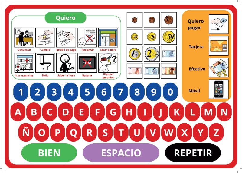 Existen otras tres secciones con los títulos 'Necesito', 'Me siento' y 'Quiero', para expresar necesidades especiales respecto a la audición, la vista, dificultades motoras, el uso del maletero, malestares o mareos, palabras básicas como gracias o perdón, y también para facilitar la comunicación respecto al coste del servicio, cómo pagar, sacar dinero o preguntar la hora, entre otras. Para conversaciones más específicas o más complejas, se establece una ilustración con un teclado, con todas las letras y números.