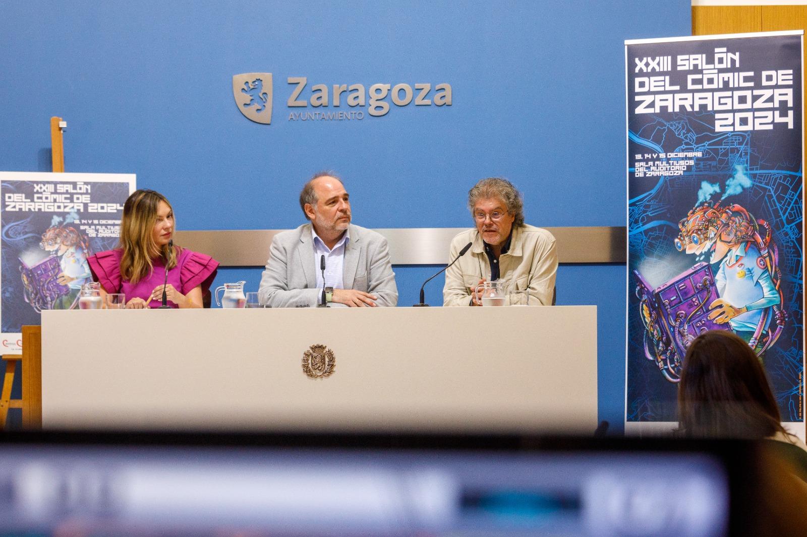 El consejero de Participación y Régimen Interior, Alfonso Mendoza, ha presentado el cartel, junto al ilustrador Fernando de Felipe en una rueda de prensa en la que han informado que el Salón del Cómic se celebrará un año más en diciembre en la sala Multiusos de Zaragoza, por la que el año pasado pasaron cerca de 15.000 visitantes.