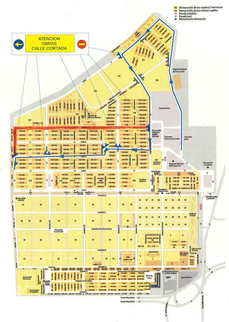 Con motivo de las obras de asfaltado de la Calle H y parte de la Calle 23 del Cementerio de Torrero, entre el 23 y 30 de septiembre, ambos incluidos, se va a modificar el acceso rodado según el siguiente plano, quedando cortadas las calles I, 13, 22, H y 23.