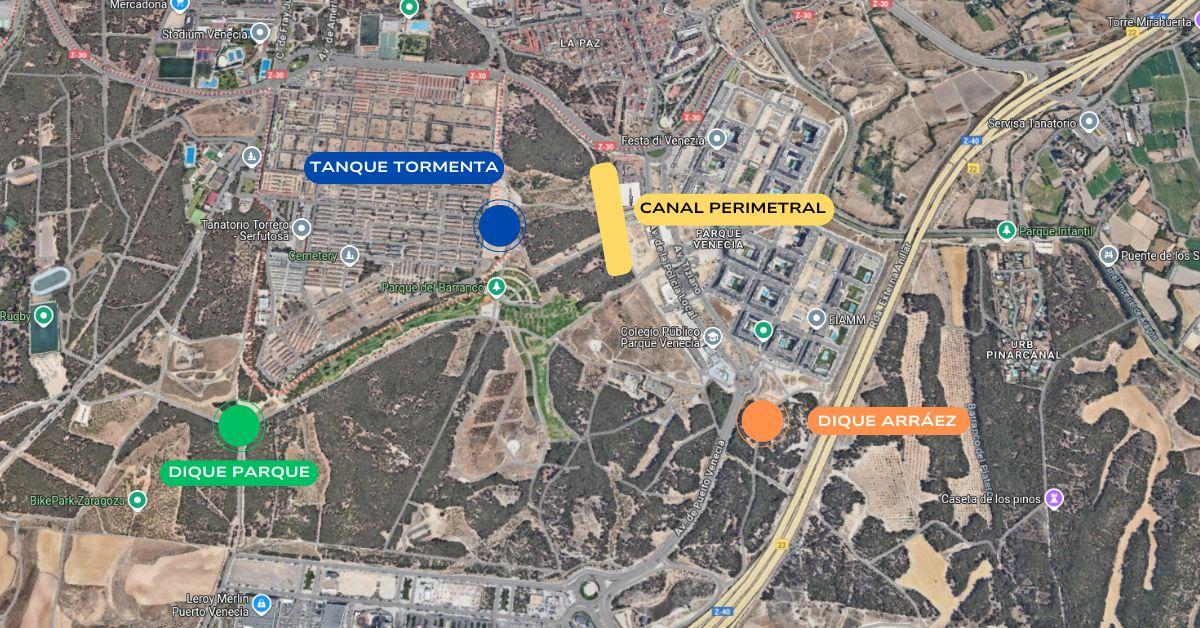 "Hasta la fecha, ya se han ejecutado las actuaciones que evitan las afecciones directas sobre los equipamientos del barrio: la construcción de un muro perimetral en la trasera del colegio, que hizo el Gobierno de Aragón, y los sensores aguas arriba y el cambio del tamaño de los colectores, ejecutados por el Ayuntamiento", ha recordado el consejero de Urbanismo, Infraestructuras, Energía y Vivienda, Víctor Serrano.