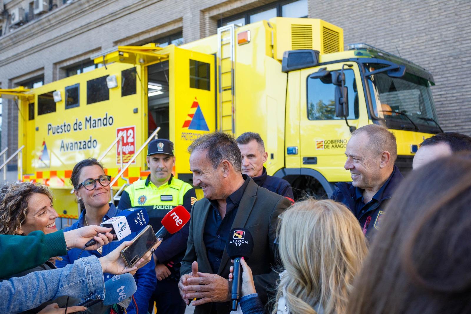 El consejero de Presidencia, Relaciones Institucionales y Seguridad Ciudadana, Ángel Lorén, acompañado por la concejal de Bomberos y Protección Civil, Ruth Bravo, y el jefe de Bomberos, Eduardo Sánchez, han visitado este puesto de mando avanzado, que en todo momento estará en contacto con el Centro de Coordinación de Emergencias, el 112 y Policía Nacional.