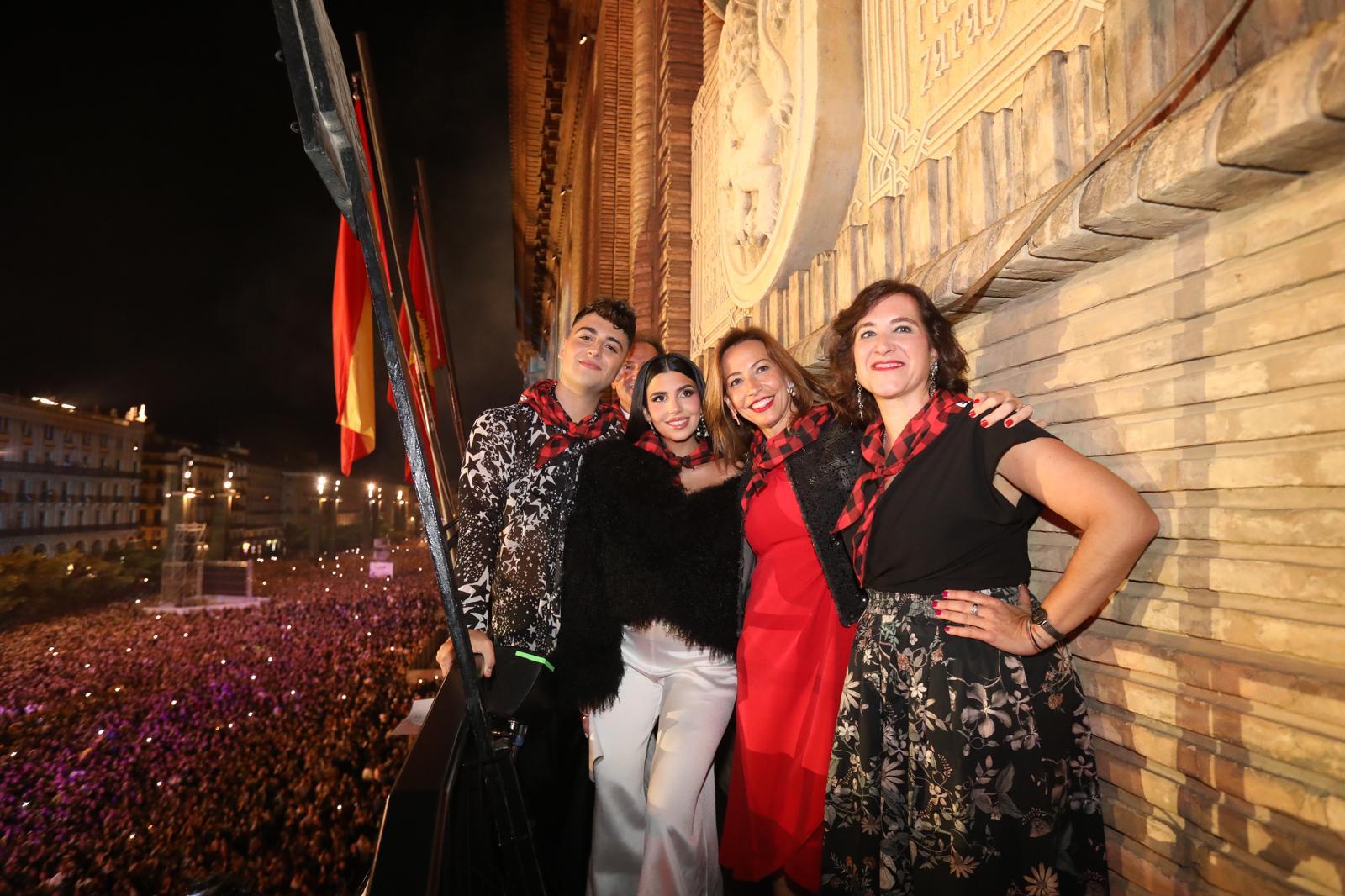 Los pregoneros han salido al balcón acompañados por la alcaldesa de Zaragoza, Natalia Chueca, quien ha deseado a todos los zaragozanos y zaragozanas unas felices fiestas del Pilar.