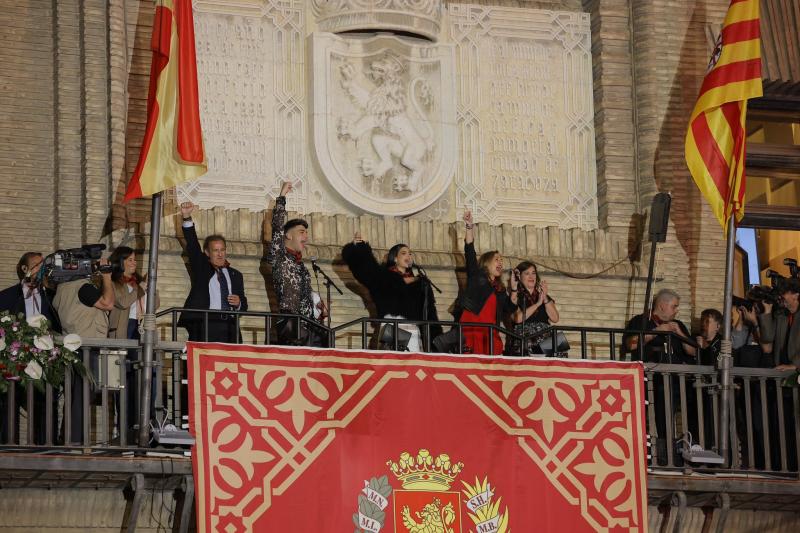 Con el lanzamiento del cohete desde el balcón del Ayuntamiento se inician las Fiestas del Pilar 2023, que este año ha contado como pregoneros con los cantantes de OT Naiara (ganadora) y Juanjo (finalista), que han aprovechado para regalar también sus voces a todos los asistentes a la Plaza del Pilar.