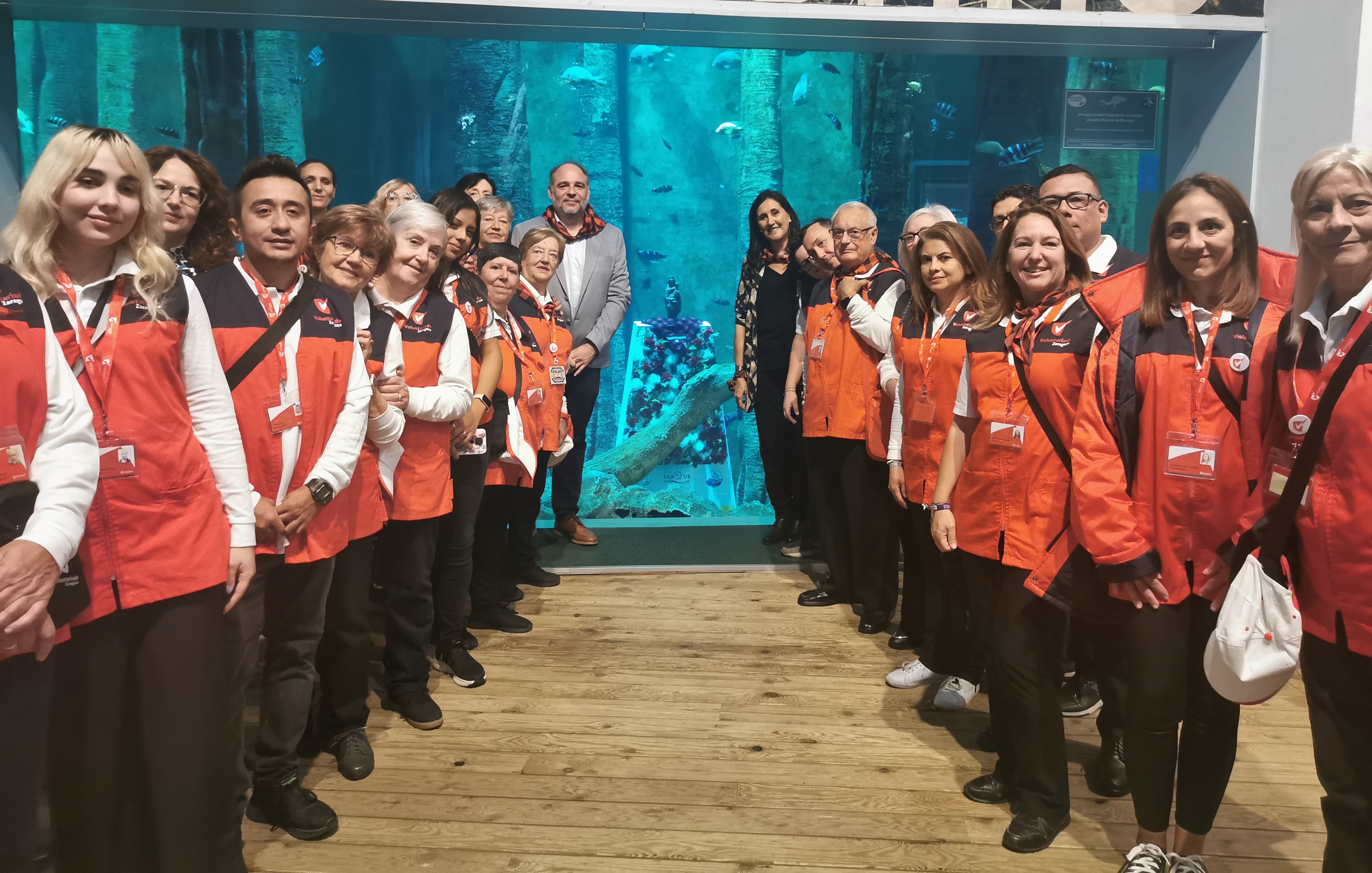 Este acto ha sido para ellos un anticipo de la tradicional Ofrenda de Flores del día grande de las Fiestas, en la que colaboran de forma altruista con la organización Durante todo el año, los Voluntarios de Zaragoza apoyan a la Fundación del Acuario en la organización de actividades socioculturales