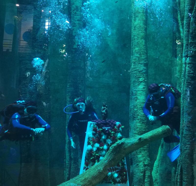 Los Voluntarios de Zaragoza han protagonizado la ofrenda floral más subacuática a la Virgen del Pilar después de que el año pasado lo hicieran las personas mayores de la ciudad. Ha sido este viernes en el Acuario de Zaragoza, donde dos buzos han depositado flores a la patrona de la Hispanidad, que en esta ocasión se encontraba sumergida en el agua y rodeada de peces.