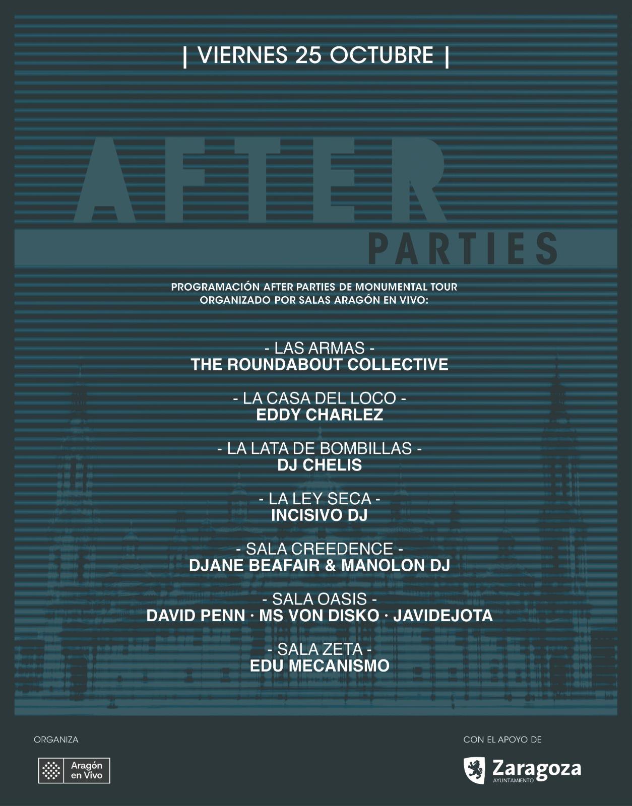 La asociación Aragón en Vivo, que aúna a los locales que programan música en directo en Zaragoza, han impulsado una iniciativa para completar y darle continuidad a la música que agitará la Plaza del Pilar entre las 21.00 y las 00.00 del viernes 25 de octubre. Las "After Parties" de Monumental Tour llegan con la programación propia de estos locales después del evento para todo aquel que quiera seguir disfrutando de la música electrónica en un día tan distinguido para la ciudad. En concreto, la programación que han preparado en torno al final de Monumental Tour es la siguiente: