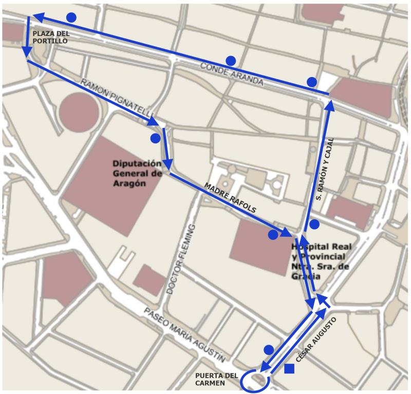 Además será necesario modificar el recorrido de las líneas del bus urbano L32, L33, L34, L52, N2, N3 y N7 y las nocturnas N12 y N21 del Consorcio de Transportes del Área de Zaragoza. Estas líneas no podrán circular por el eje Conde Aranda-César Augusto y lo harán, en su lugar, por Pº María Agustín.