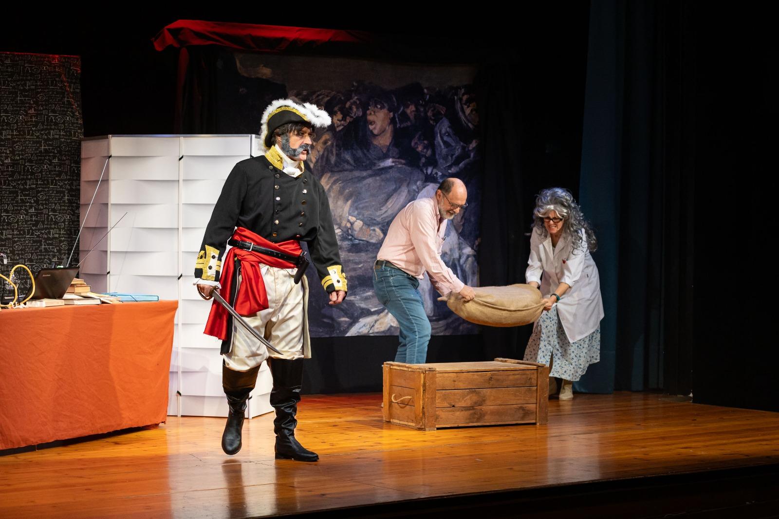 Con el telón de fondo de un viaje en el tiempo, en la edición de 2024, Goya, Agustina de Aragón y el general Palafox se convierten en los protagonistas de una obra que traerá la Zaragoza de los Sitios hasta el presente. Esta mañana se ha celebrado la primera de las ocho sesiones que van a tener lugar en las bibliotecas y centros cívicos y de mayores de Zaragoza. Concretamente, la sesión de estreno ha sido en el Salón de Actos Centro Cívico Salvador Allende, donde además de los 115 alumnos de 3º ESO del IES Grande Covián han asistido la consejera de Cultura, Educación y Turismo, Sara Fernández, y Paloma Espinosa, concejala delegada de Educación. "La acogida es muy buena porque la compañía consigue atraer la atención de los adolescentes hacia acontecimientos del pasado de una manera muy divertida y perspicaz", ha señalado Fernández minutos después de la actuación.