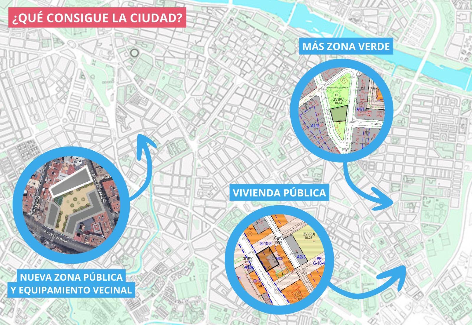 "Se trata de una operación que gran interés público para toda la ciudad, porque además de desbloquear un gran vacío urbano en el centro de la capital, cuya solución requerían los vecinos del entorno desde hace décadas, extendemos los beneficios a otros distritos, donde ganarán zonas verdes y vivienda de alquiler asequible", ha expresado el consejero municipal Víctor Serrano, "a lo que se suman unos ingresos en metálico para las arcas municipales, una nueva zona peatonal verde en el ámbito de desarrollo y un terreno muy valioso para levantar un equipamiento municipal en un distrito con graves carencias de estos servicios públicos".
