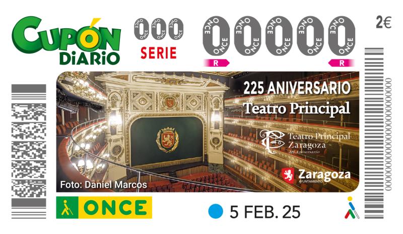 El 225 aniversario del Teatro Principal de Zaragoza será el tema del Cupón diario de la ONCE del próximo 5 de febrero. De esta manera, la organización se suma a las celebraciones por esta efeméride, que incluyen un ciclo de conferencias sobre el edificio o una gala especial que tendrá lugar en el mes de abril.