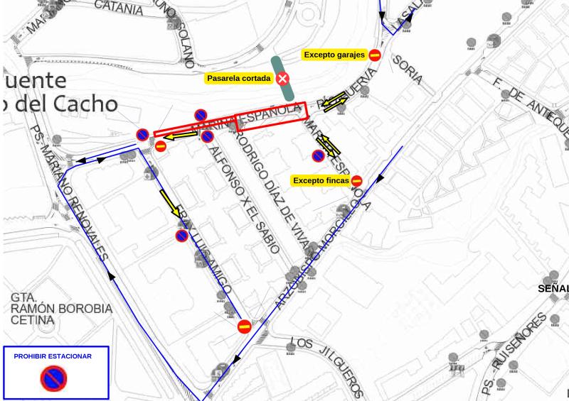 De este modo, el tramo de Marina Española entre los números 4 y 10 quedará en fondo de saco y doble sentido de circulación para los garajes afectados entre las calles de Soria y de Marina Española. E, igualmente, en el tramo de Marina Española entre los números 10 y 20, se instala el doble sentido para dar servicio a las fincas del tramo de Marina Española entre Arzobispo Morzillo y Río Huerva. Se prohibirá el estacionamiento en 15 metros al inicio de Marina Española, para el cruce de vehículos, y en 5 metros al final, para desplazar la reserva del centro de rehabilitación afectada.