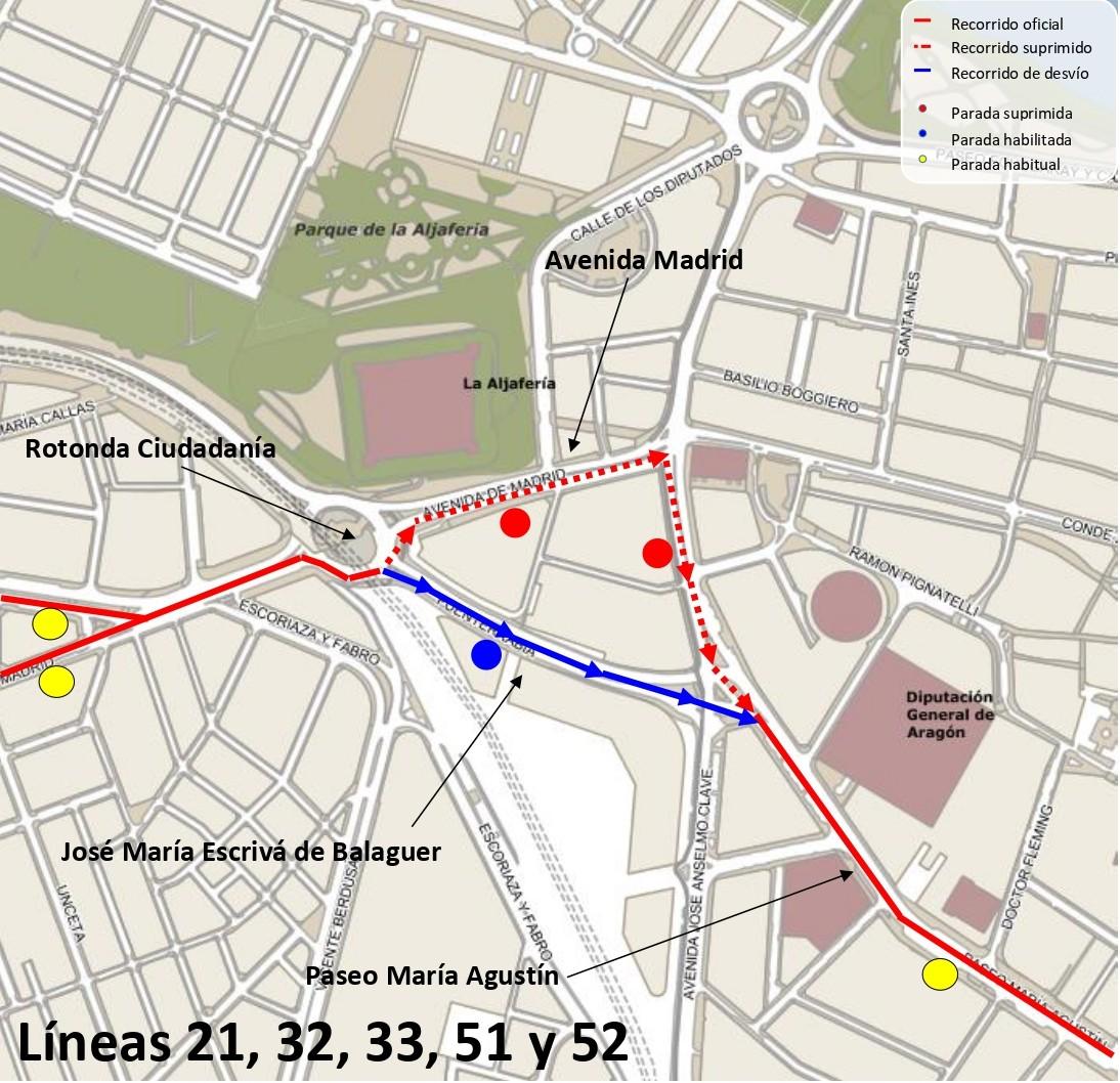 En cuanto al transporte público, en primer lugar, se desviarán, en coordinación con Avanza, las líneas de bus 21, 32, 33, 51 y 52 sólo en el recorrido hacia el centro de la ciudad. Esto conlleva que, desde la plaza de la Ciudadanía, en vez de hacer parada en avenida de Madrid, frente a La Aljafería, se desviarán por la avenida de Escrivá de Balaguer (con una parada provisional en esta vía).