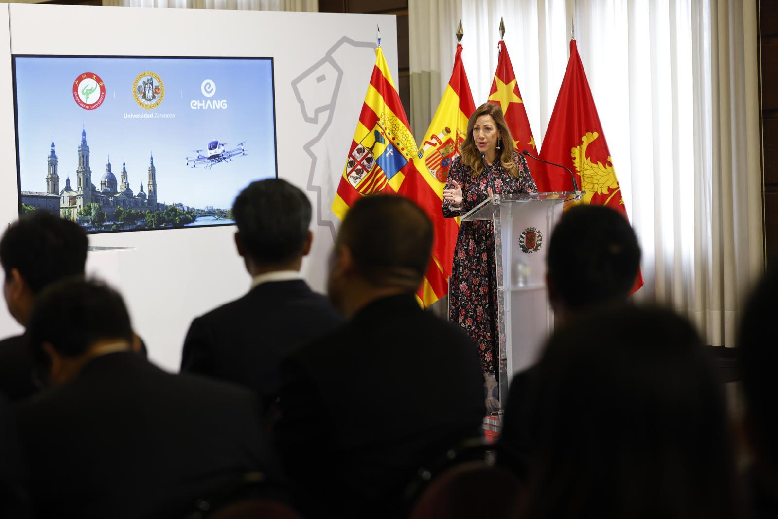 Natalia Chueca ha recordado su reciente viaje comercial a China y ha aseverado que "al igual que hoy se firma este acuerdo con Ehang, tenemos antecedentes en Zaragoza de sólidas empresas chinas aquí asentadas como Cablescom, Teltronic y las de inminente implantación como TDG Group, el holding que ha anunciado 120 millones de euros de inversión en nuestra ciudad en los próximos 5 años".