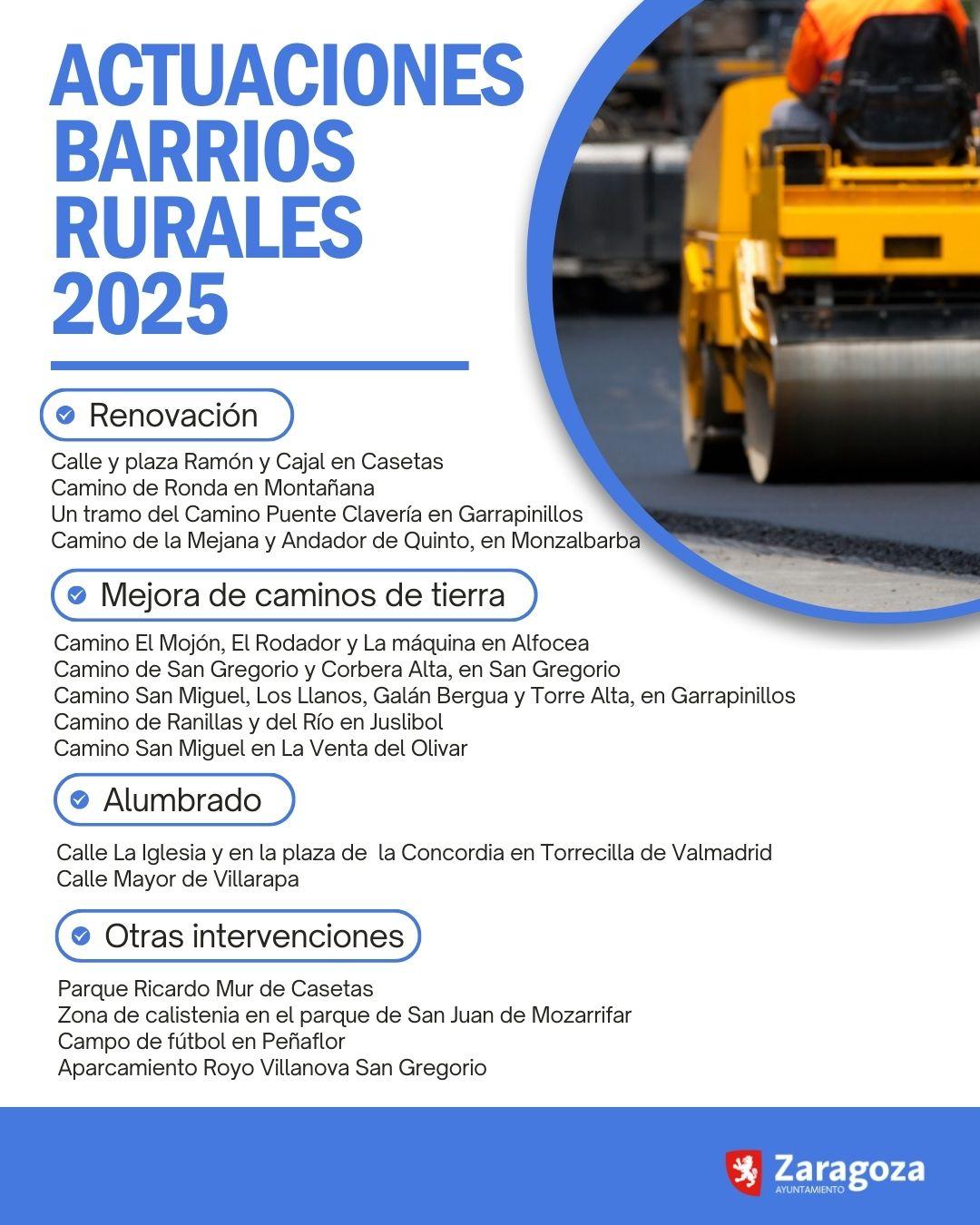 En concreto, en se renovará la calle y plaza Ramón y Cajal en Casetas, el camino de Ronda en Montañana, un tramo del Camino Puente Clavería en Garrapinillos y el Camino de la Mejana y el andador de Quinto, en Monzalbarba. Al mismo tiempo, se acondicionarán distintos caminos de tierra, entre ellos el camino El Mojón, El Rodador y La máquina en Alfocea; el camino de San Gregorio y Corbera Alta, en San Gregorio y el camino San Miguel, Los Llanos, Galán Bergua y Torre Alta, en Garrapinillos. Además, se mejorará también el camino de Ranillas y del Río en Juslibol y el camino San Miguel en La Venta del Olivar.
