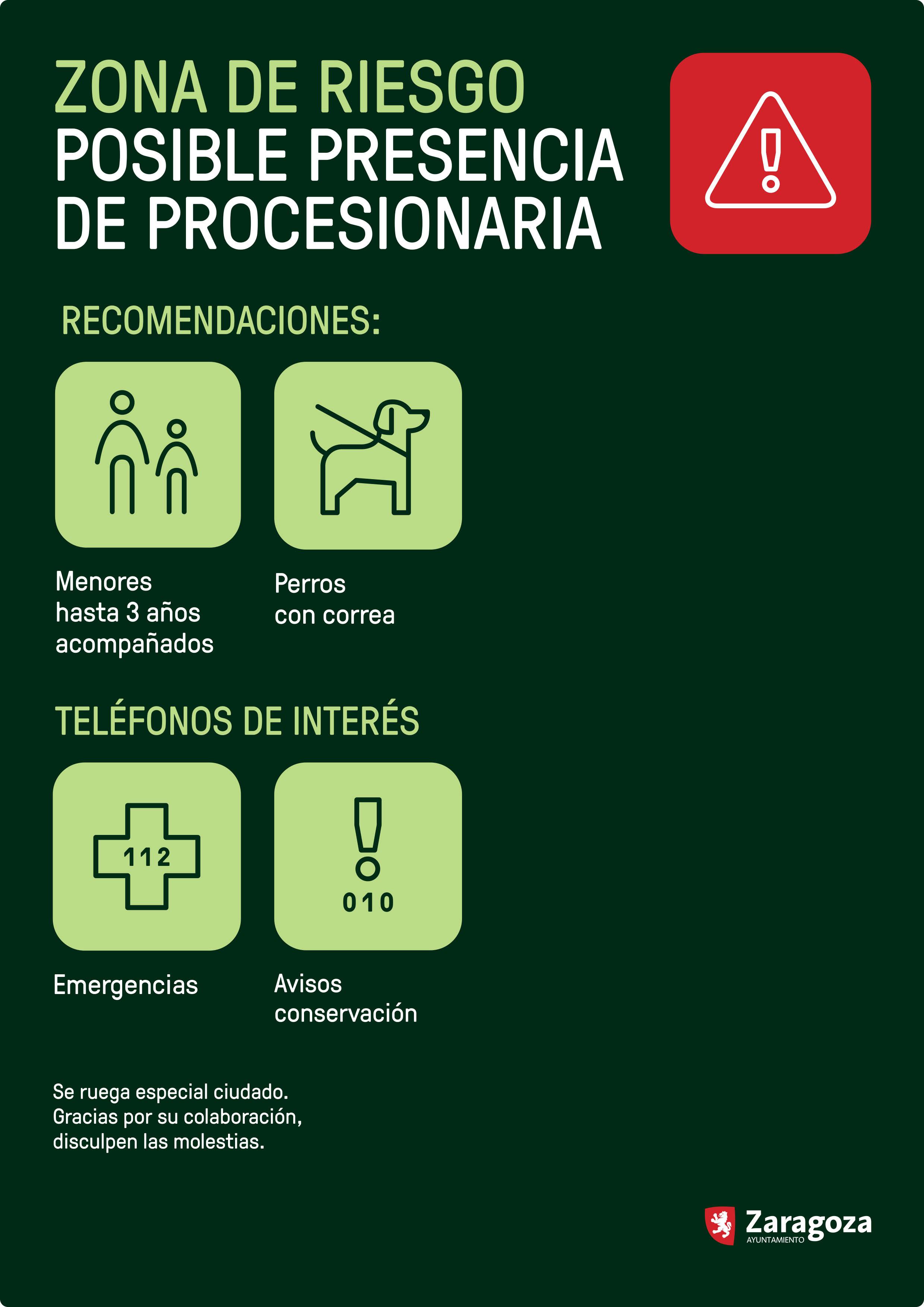 ✔ En zonas verdes donde coincide un elevado número de pinos y la presencia de mascotas se han instalado carteles de aviso para que los ciudadanos extremen las precauciones durante su uso y disfrute.