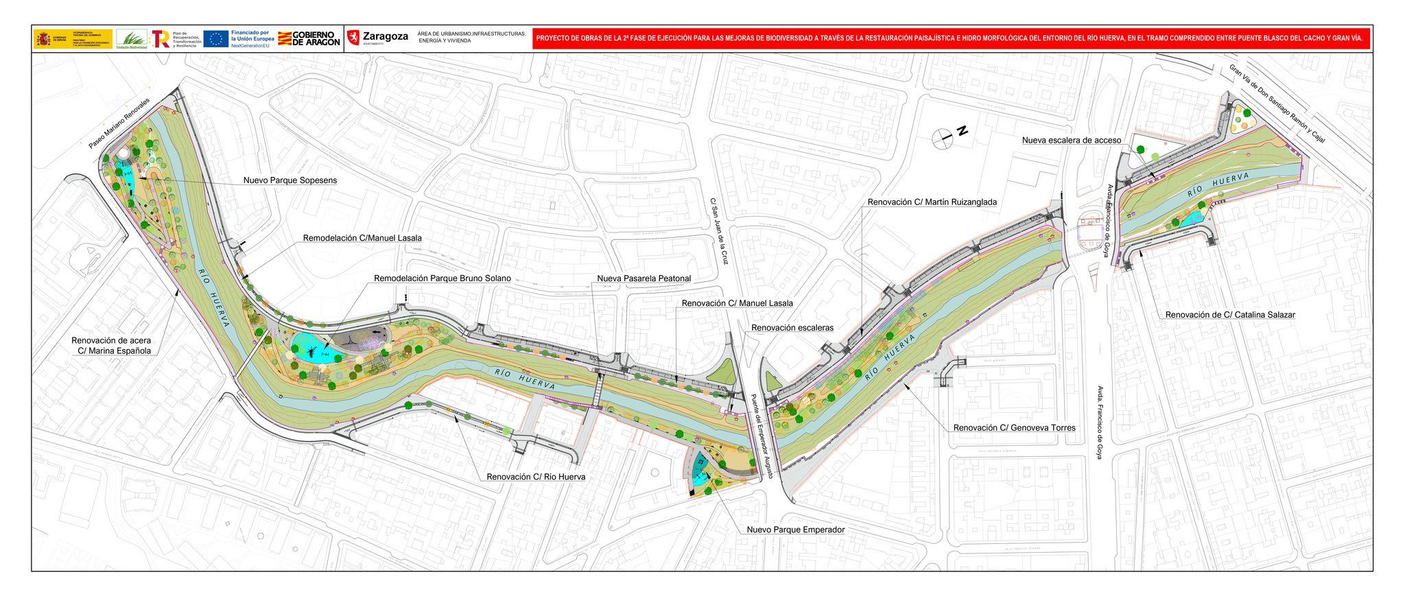 En la segunda fase del primer tramo, cuyas obras durarán 15 meses, el área del proyecto en su conjunto, que incluye viarios y zona verde pública, tiene una proyección horizontal de unos 150.000 metros cuadrados. Aquí se incluirá la continuación de los trabajos de Fase 1 en los ámbitos de aporte de sedimentos; la retirada de relleno de materiales antrópicos en río, de obstáculos longitudinales y de obras de fábrica; el control de especies exóticas invasoras que pudieran haber rebrotado tras la Fase 1; la mejora de las sendas del Huerva; la creación de una nueva pasarela peatonal de 25 metros de largo y 3,5 metros de ancho que comunicará las calles de Viva España y de Manuel Lasala; la renovación de la red de saneamiento y abastecimiento de agua en varias calles adyacentes al Huerva; y la ejecución de un paso de peces en el ojo del puente del Canal sobre el río Huerva. Además, se implantarán refugios y pasos de fauna con la instalación de cajas nido para aves, refugios para murciélagos y hoteles de insectos.