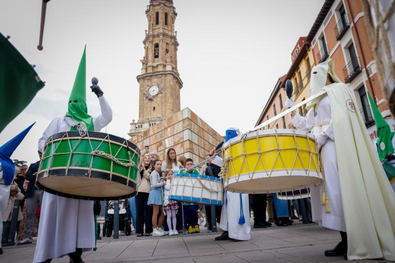 El sonido del tambor y del bombo, introducido en 1940, es una de las peculiaridades de la Semana Santa zaragozana. La Cofradía de las Siete Palabras fue la pionera en traer a sus procesiones los toques tradicionales del Bajo Aragón que, más tarde, fueron introducidos en sus desfiles por el resto de las cofradías. Hoy en día, ha calado profundamente en el senti miento de los zaragozanos hasta ser con siderado, cada vez más, como una de sus señas de identidad. El momento final de la procesión está acompañado por los redo bles más espectaculares donde las manos dejan paso al corazón y el cofrade vuelca toda su emoción despidiendo a sus pasos.