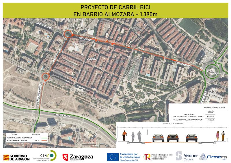 Esta infraestructura se sumará a las ya realizadas, también con cargo a los fondos europeos recibidos por el Gobierno de Aragón, en el marco de Plan de Recuperación Transformación y Resiliencia de los fondos NextGeneration de la UE. Entre las obras urbanas gestionados por el CTAZ se encuentran los nuevos carriles bici de Pedro III, Fray José Casanova, Avenida Pablo Picasso (todos ellos ya en marcha) y éste de Almozara. La inversión en esta nueva actuación será de 440.646,15 euros.