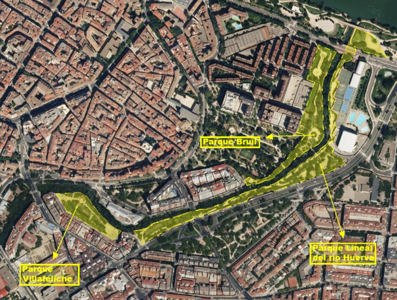 Al otro lado del río está el Parque Bruil, con 33.420 m² es, es uno de los parques de mayor extensión de la ciudad de Zaragoza. Está situado en el Casco Histórico de la ciudad, y puede destacarse del parque su gran superficie de césped, así como árboles de gran altura, varias pistas deportivas y de petanca y las zonas de juegos infantiles. Todo esto le aporta una elevada importancia de carácter social. Por ello, se mantendrá en sus condiciones centrando el tratamiento en la parte de la ribera haciéndola más accesible y conectada con el río que transcurre por su lado.
