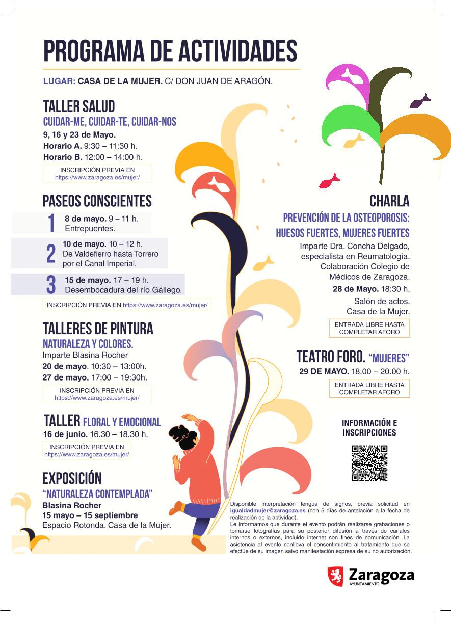 • Teatro Foro: "Mujeres". 29 de mayo. Casa de la Mujer • Taller floral y emocional. 16 de junio. Casa de la Mujer. Para participar en los diferentes talleres y paseos es necesaria inscripción previa. https://www.zaragoza.es/sede/portal/igualdad/servicio/cultura/evento/programa/2245