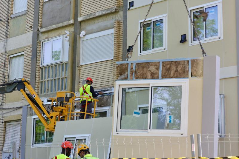 El innovador proyecto piloto InCUBE, destinado a la transformación del edificio 1-3-5-7 de la calle de Valle de Oza dentro del área de Balsas de Ebro Viejo, ha superado hoy un nuevo hito en su proceso de rehabilitación con el montaje de una de las torres de acceso completamente modular.