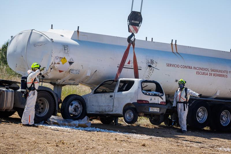 Los Bomberos de Zaragoza realizan un simulacro de un accidente de tráfico con sustancias peligrosas en Peñaflor