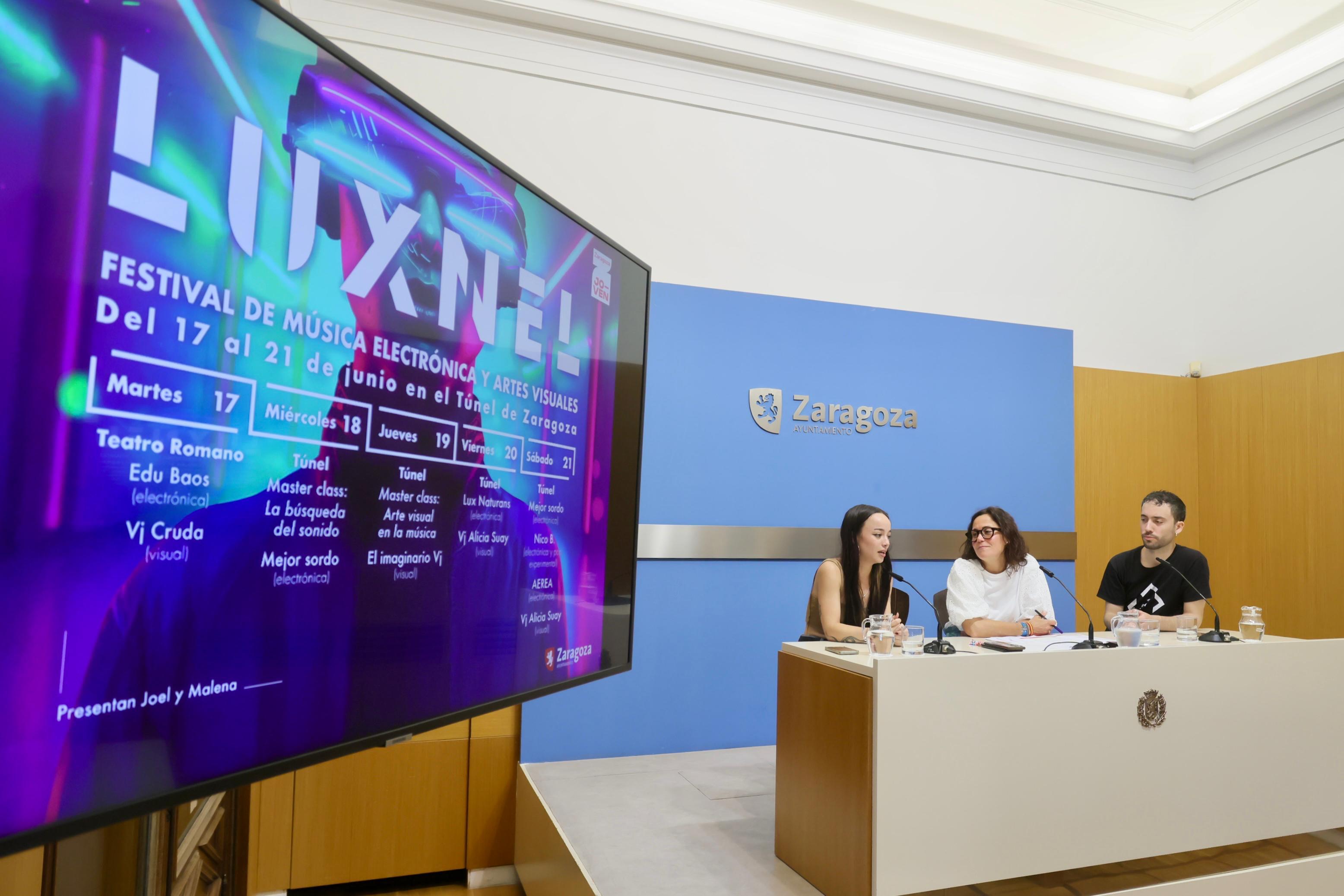 El gran evento de la programación será el sábado 21 de junio cuando, a las 21.00 horas, se abran las puertas del Túnel y comience una noche sensorial en la que actuarán Mejor Sordo, Cambio, Nico B y Aérea, ofreciendo un viaje inmersivo lleno de luz, sonido y tecnología que se alargará hasta el 0.55 horas. La concejal delegada de Juventud del Ayuntamiento de Zaragoza, Ruth Bravo, ha presentado en rueda de prensa este festival, junto a los dos jóvenes presentadores que guiarán todas las actividades, Malena Goya y Joel Rico.