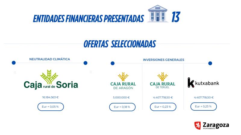 El primer lote, el de las inversiones de desarrollo sostenible (16.184.563 euros), se ha adjudicado íntegramente a Caja Rural de Soria, con un tipo de interés EUR trimestral + 0,05%. Con él podrán financiarse, por ejemplo, la promoción de viviendas de alquiler asequible, la compra de autobuses eléctricos, el Bosque de los Zaragozanos, el proyecto de energía limpia Neutralpath, la reconversión de la antigua fábrica de Giesa en la futura Ciudad del Cine, la Harinera de Casetas, el soterramiento de la línea de media tensión en los Pinares de Venecia, la adquisición de nuevos vehículos para la Policía Local, la Ludoteca de Parque Venecia y obras de eficiencia energética en instalaciones municipales y alumbrado público.