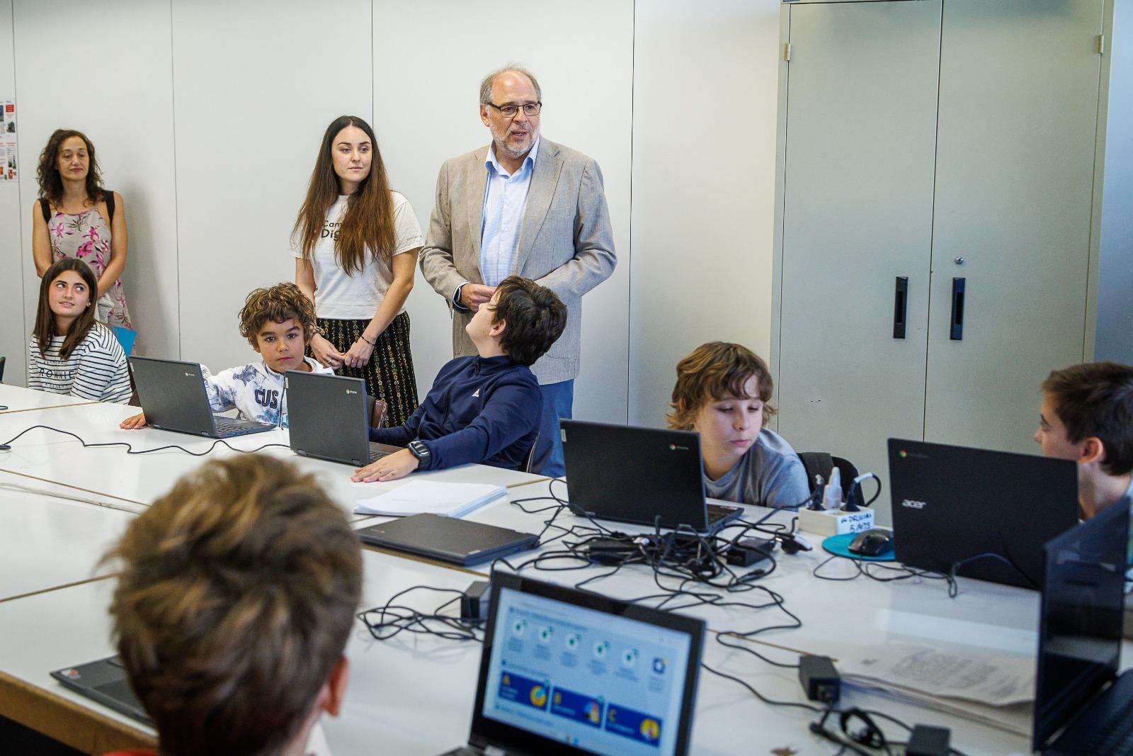 El consejero de Participación Ciudadana y Régimen Interior del Ayuntamiento de Zaragoza, Alfonso Mendoza, y la coordinadora de programas en la Fundación Cibervoluntarios, Alba Soler, han visitado hoy en el Centro Cívico Delicias una de las actividades de Campamento Digital, una iniciativa de formación presencial y gratuita para niños, niñas y jóvenes de 9 a 17 años en las que crean, juegan y se divierten mientras aprenden a hacer un uso seguro y responsable de la tecnología, guiados por educadores especializados.
