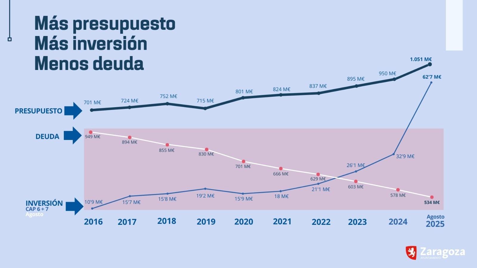 La alcaldesa Natalia Chueca ha destacado que "Zaragoza está batiendo récord de inversión por habitante a pesar de ser una de las ciudades de España con menor recaudación por habitante". La baja presión fiscal de Zaragoza se refleja en las cifras oficiales del Ministerio de Hacienda, recogidas en el último informe del Consejo General de Economistas, según las cuales la capital aragonesa recauda 456,6 euros por habitante, lejos de la media nacional, que asciende a 556,31 euros.