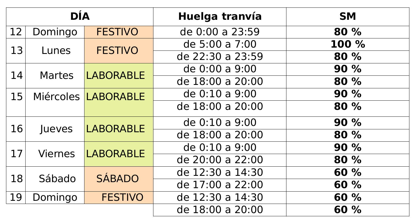A continuación, se muestra la tabla con los Servicios Mínimos decretados con motivo de los paros previstos en el servicio del Tranvía de Zaragoza entre los días 12 y 19 de octubre.