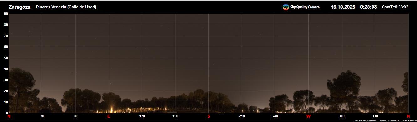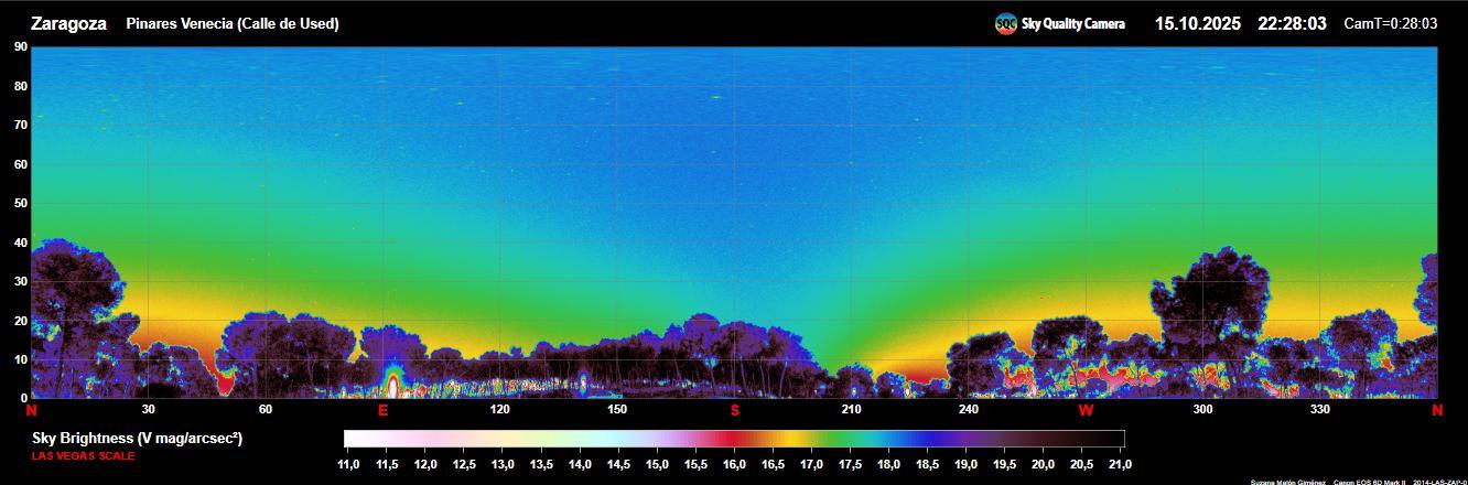 Para medir el brillo del fondo del cielo (la contaminación lumínica), los equipos técnicos están registrando el cielo zaragozano. Para ello se emplean "cámaras all sky, son ojos de pez que captan imagen de 360 grados de todo lo que es el cielo, no solamente en el zénit, sino también en el horizonte", ha desgranado Susana Malón, quien recuerda que "eso nos va a permitir ver la comparación entre el antes y el después del cambio de las luminarias, y observar las consecuencias de pasar de las farolas más contaminantes, que ahora están instaladas, a las más eficientes, que serán las que a partir de noviembre irá instalando el Ayuntamiento de Zaragoza". La imagen captada es como una cúpula que luego se puede también analizar de forma apaisada. Las cámaras están calibradas con observatorios profesionales y un software analiza después cada píxel asignándole un valor de contaminación.