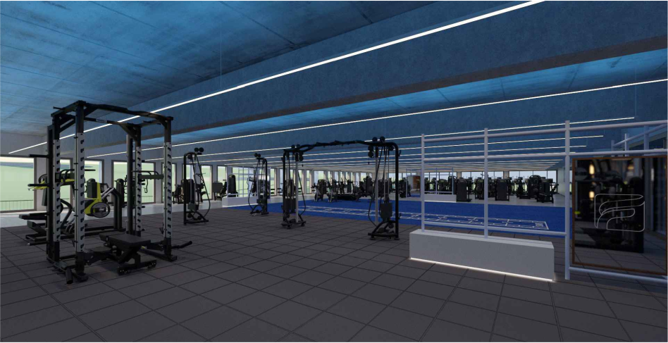 Por otro lado, en la primera planta se situarán los vestuarios de usuarios de actividad de seco, con sala de fitness (cardio, fuerza, peso libre, entrenamiento funcional y estiramientos) y sala infantil. La terraza que cubre la parte de la edificación de planta baja generará un espacio de outdoor x-training en comunicación directa con el área fitness.