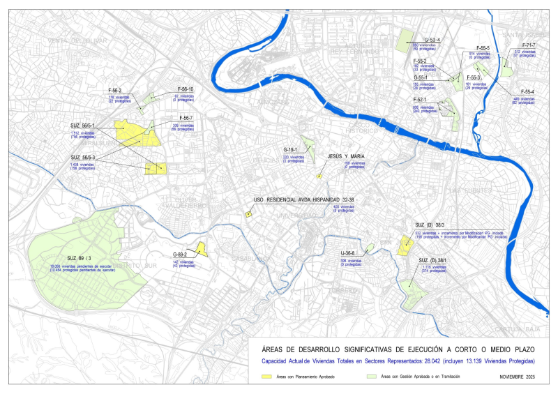 El Ayuntamiento de Zaragoza ha logrado activar áreas de desarrollo urbano de la ciudad consolidada que darán lugar a corto y medio plazo la construcción de 28.042 viviendas, de las que un 46,85% (unas 13.139) serán de protección oficial. Con todo ello, "si el parque residencial actual de Zaragoza se sitúa en unas 329.000 viviendas, el impulso de estos desarrollos urbanos supondrán incrementar un 8,52% el número de pisos en la capital aragonesa, a lo que deben sumarse todas aquellas construcciones fuera de estas grandes áreas de intervención, como pueden ser aquellas acometidas por promotores en solares concretos de la ciudad o las 2.300 viviendas públicas de alquiler asequible que impulsa el Ayuntamiento diseminadas en parcelas repartidas por toda la capital", ha apuntado el consejero de Urbanismo, Infraestructuras, Energía y Vivienda, Víctor Serrano