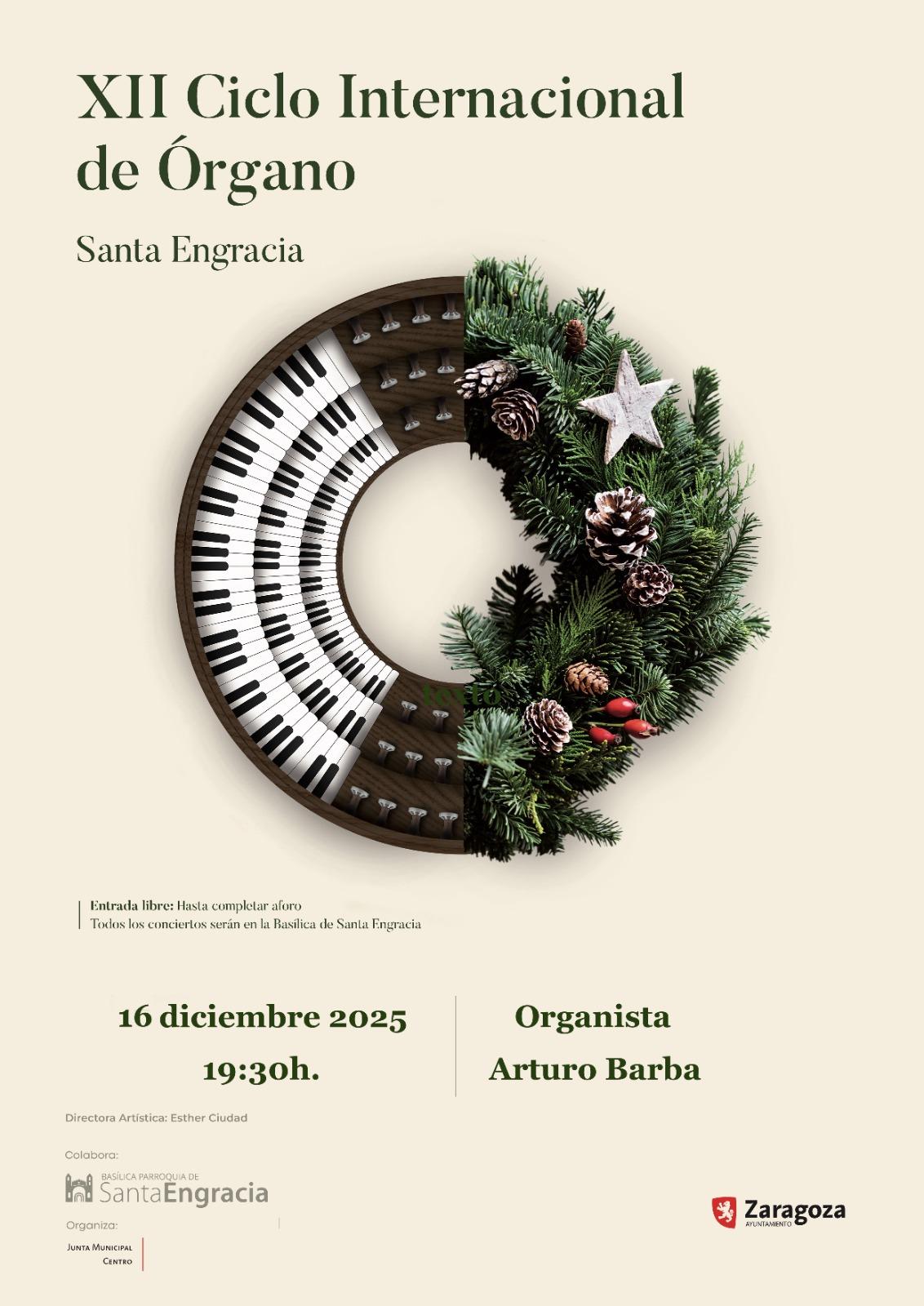 El prestigioso organista Arturo Barba Sevillano ofrecerá un concierto el día 16 de diciembre en la Basílica de Santa Engracia a las 19.30 horas, dentro del XII Ciclo Internacional del Órgano organizado por la Junta de Distrito Centro. La entrada será gratuita hasta completar aforo.